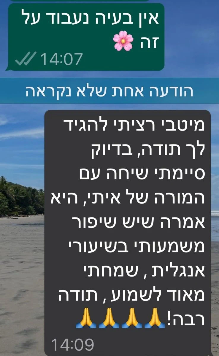 אצלי לאחר כל שיעור אתם מקבלים מידע מפורט על העבודה בשיעור, החומר הנלמד, משימות הבית ותהליך הלמידה.